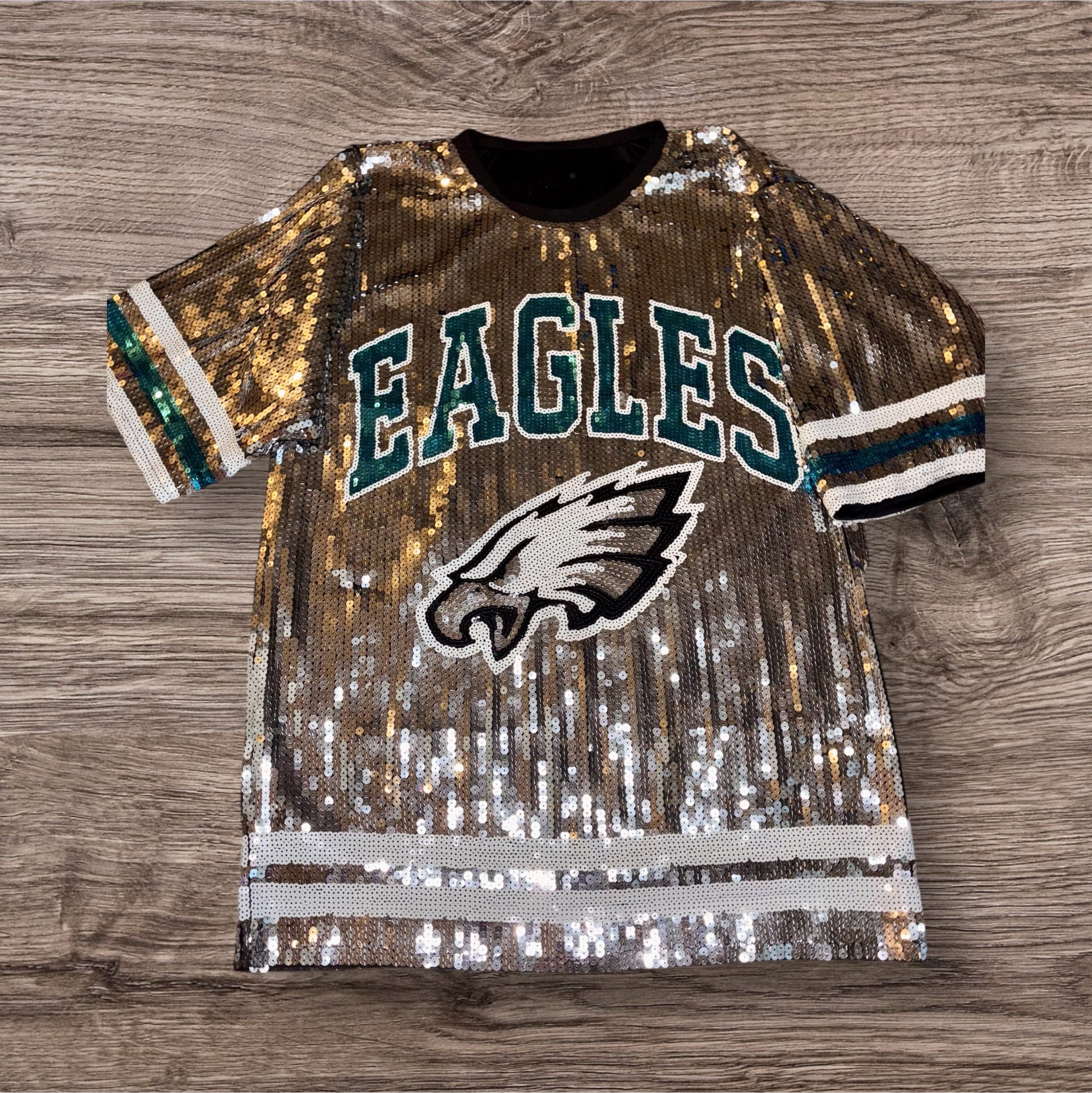 Whether you’re heading to the stadium or throwing a watch party at home, this Philadelphia Eagles sequin jersey is the perfect addition to your game day wardrobe. Get yours today and shine as bright as your team’s spirit!